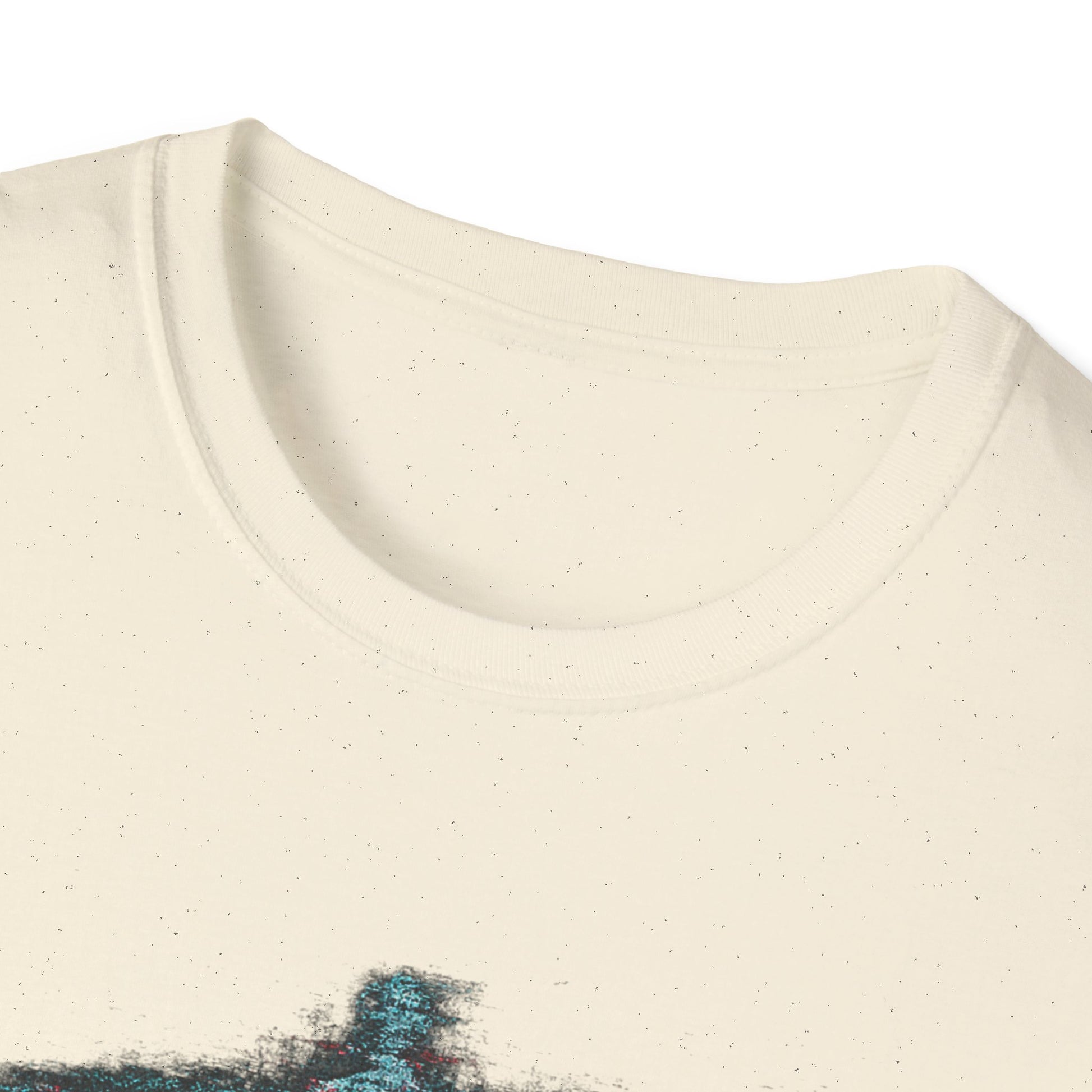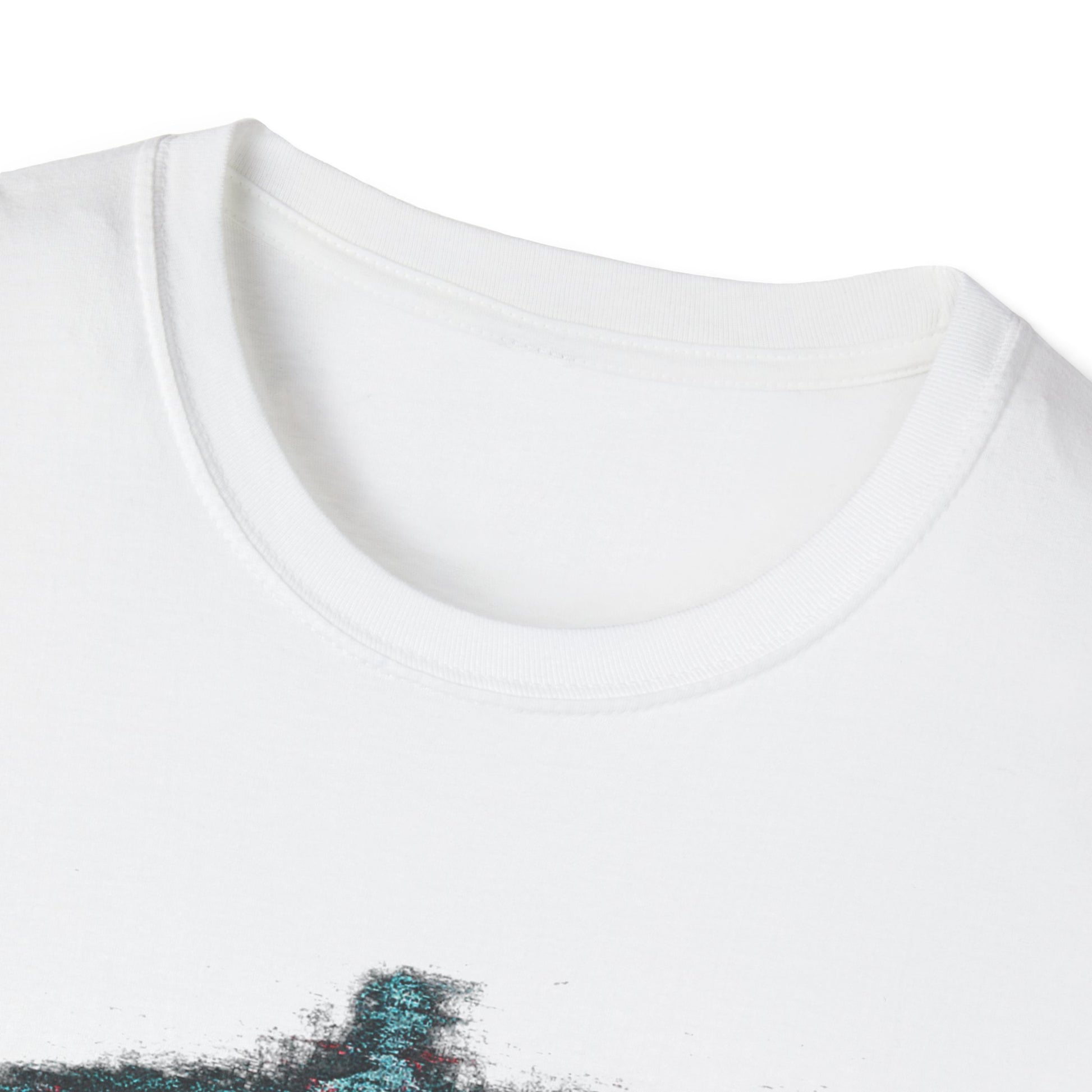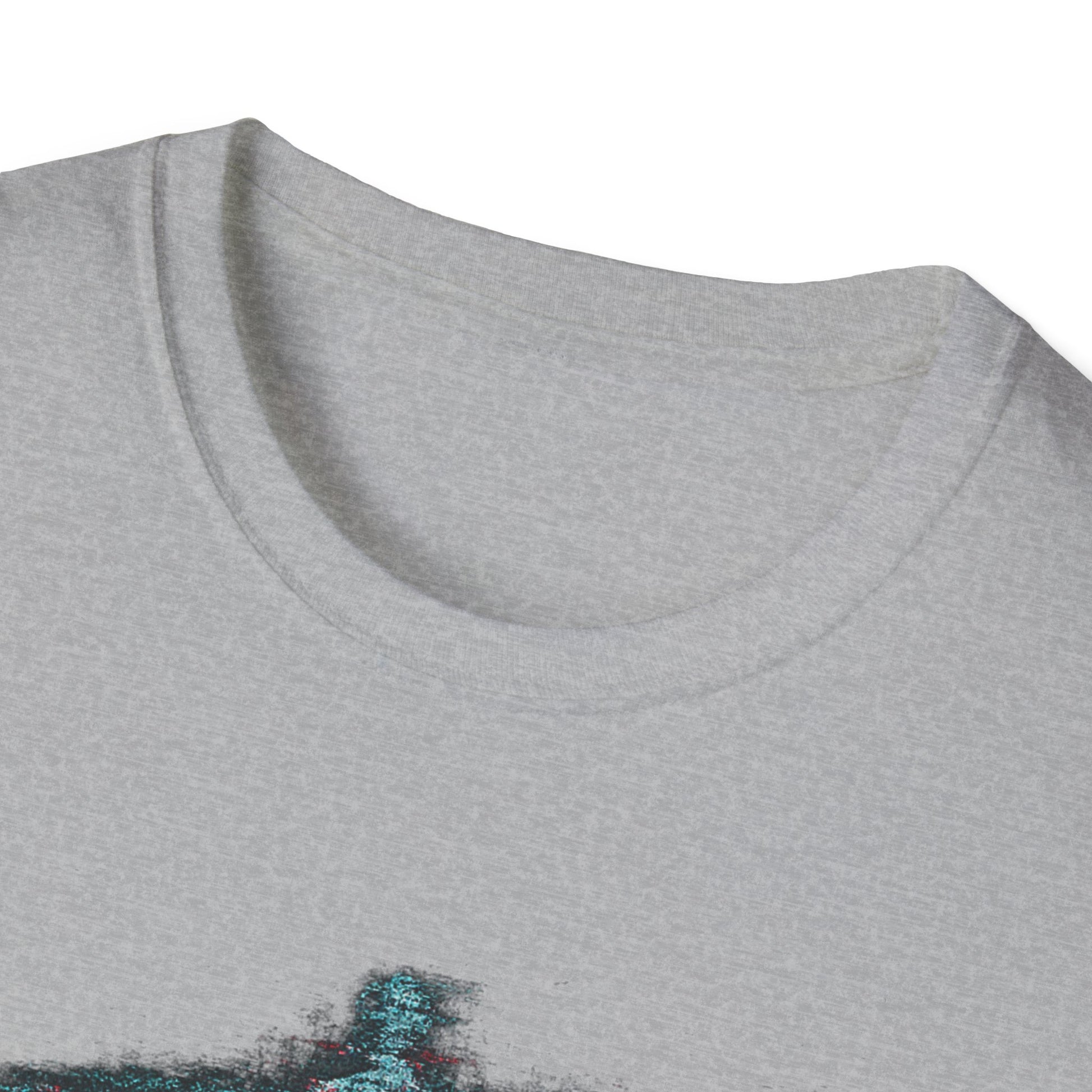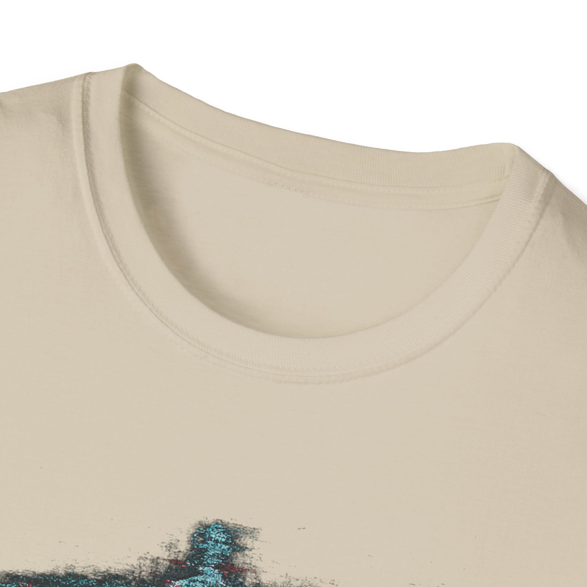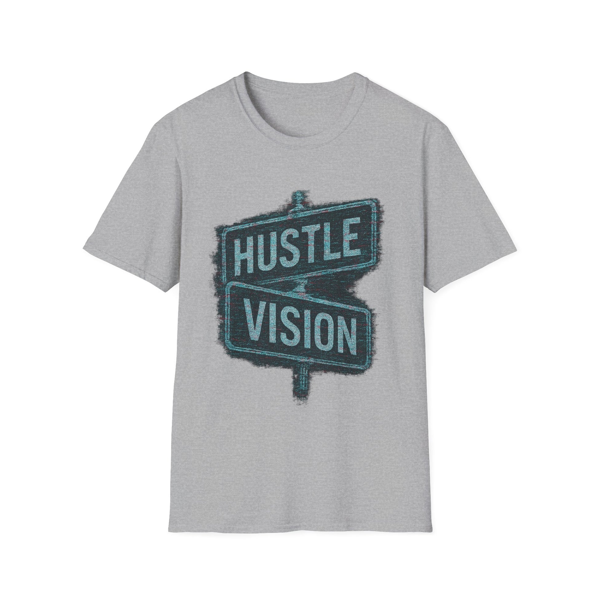 A unisex softstyle T-shirt featuring a digital static street sign design with the words 'Hustle and vision'. This shirt gives off a trendy and urban vibe, perfect for individuals looking to showcase their ambition and determination. Ideal for casual wear or as a statement piece for street style enthusiasts. Relevant for everyday wear, special occasions, and streetwear fashion enthusiasts.