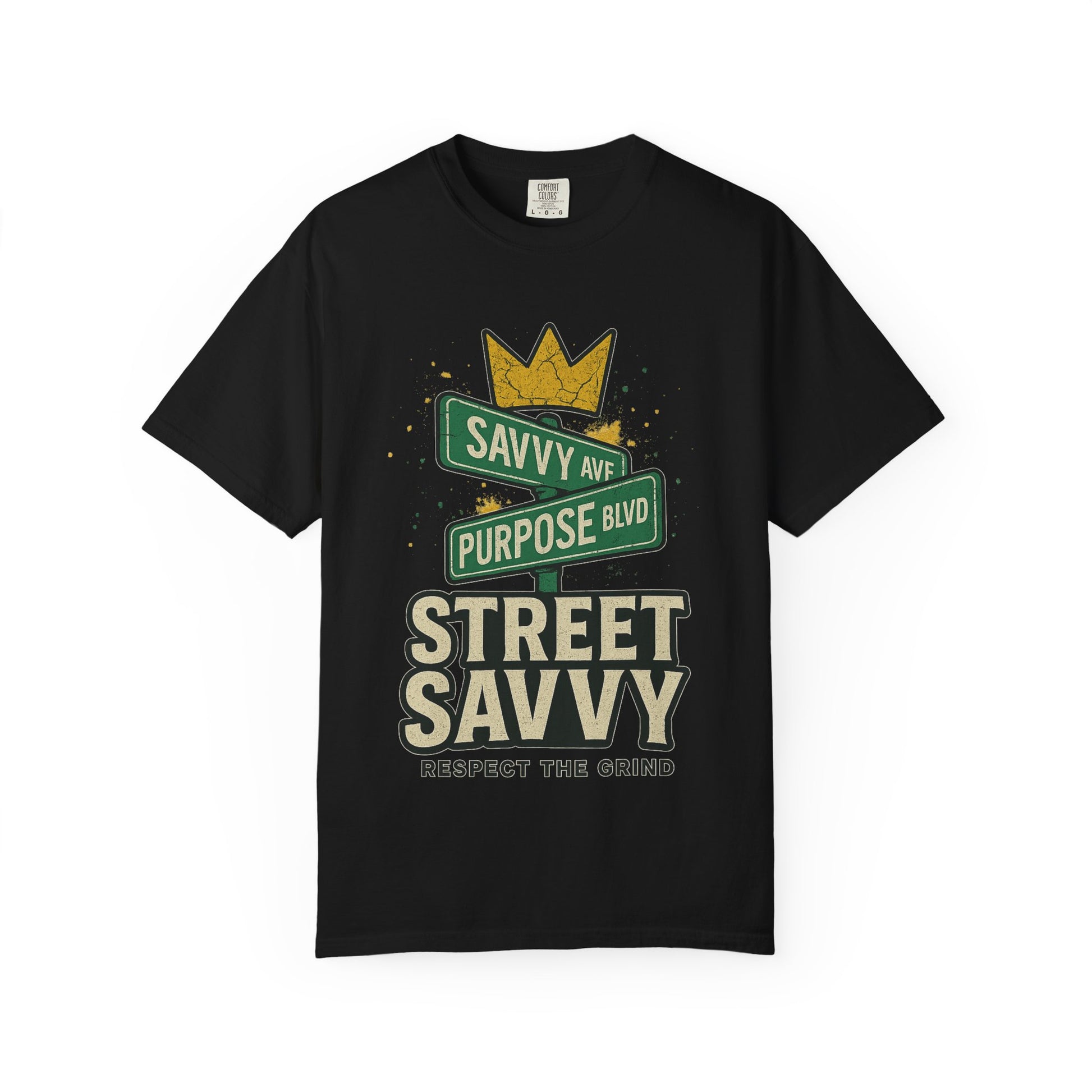 A street-style T-shirt featuring street signs, paint spots, and the message 'respect the grind'. This trendy and edgy tee is perfect for urban fashion lovers who want to make a statement. Great for those who celebrate individuality and creativity.